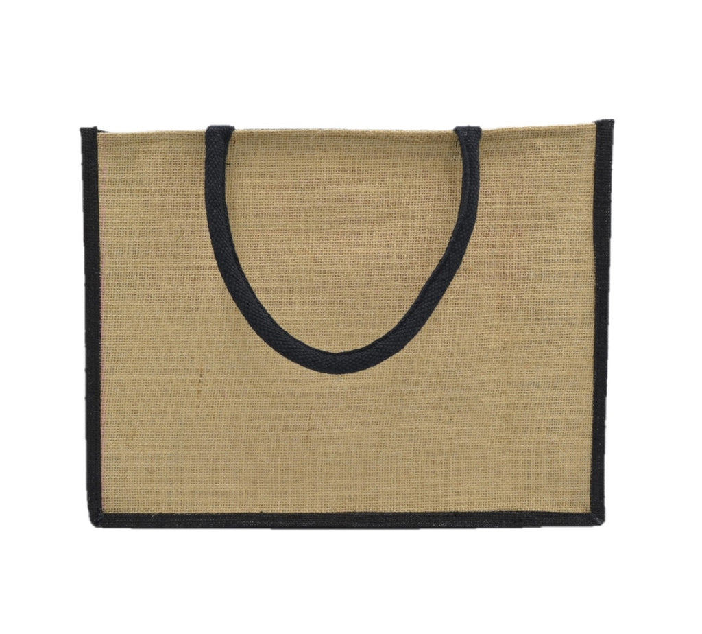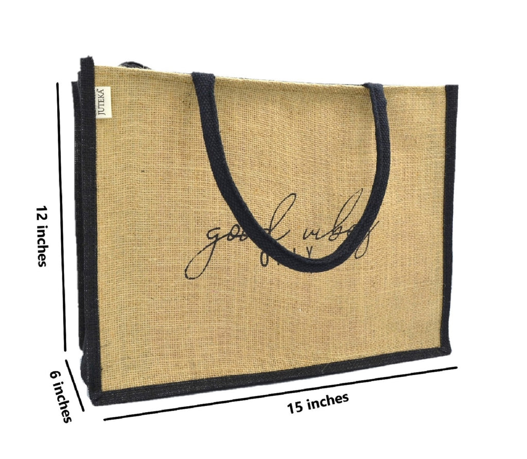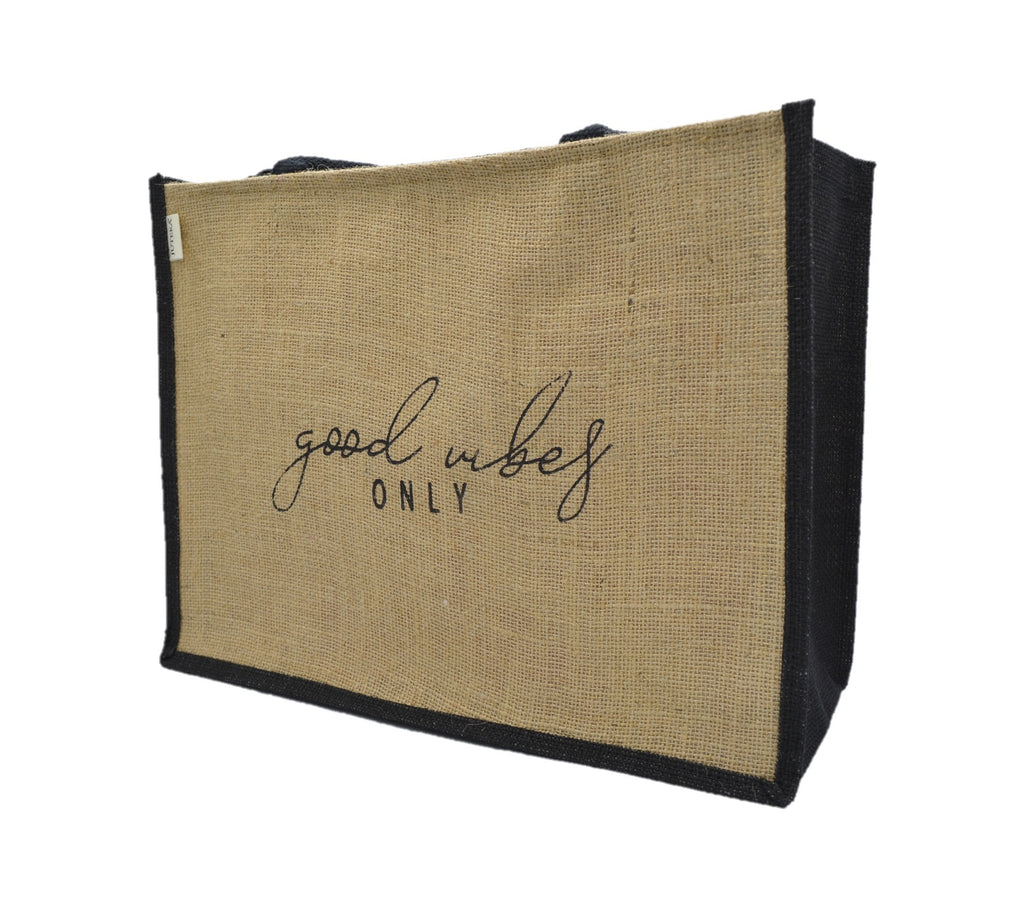 Spread positivity with this stylish and eco-friendly jute tote bag featuring a "Good Vibes Only" print. With a natural beige front and black sides, this spacious and durable bag is perfect for daily use, shopping, or gifting. The sturdy black handles provide comfort while carrying, making it both a fashionable and sustainable choice.
