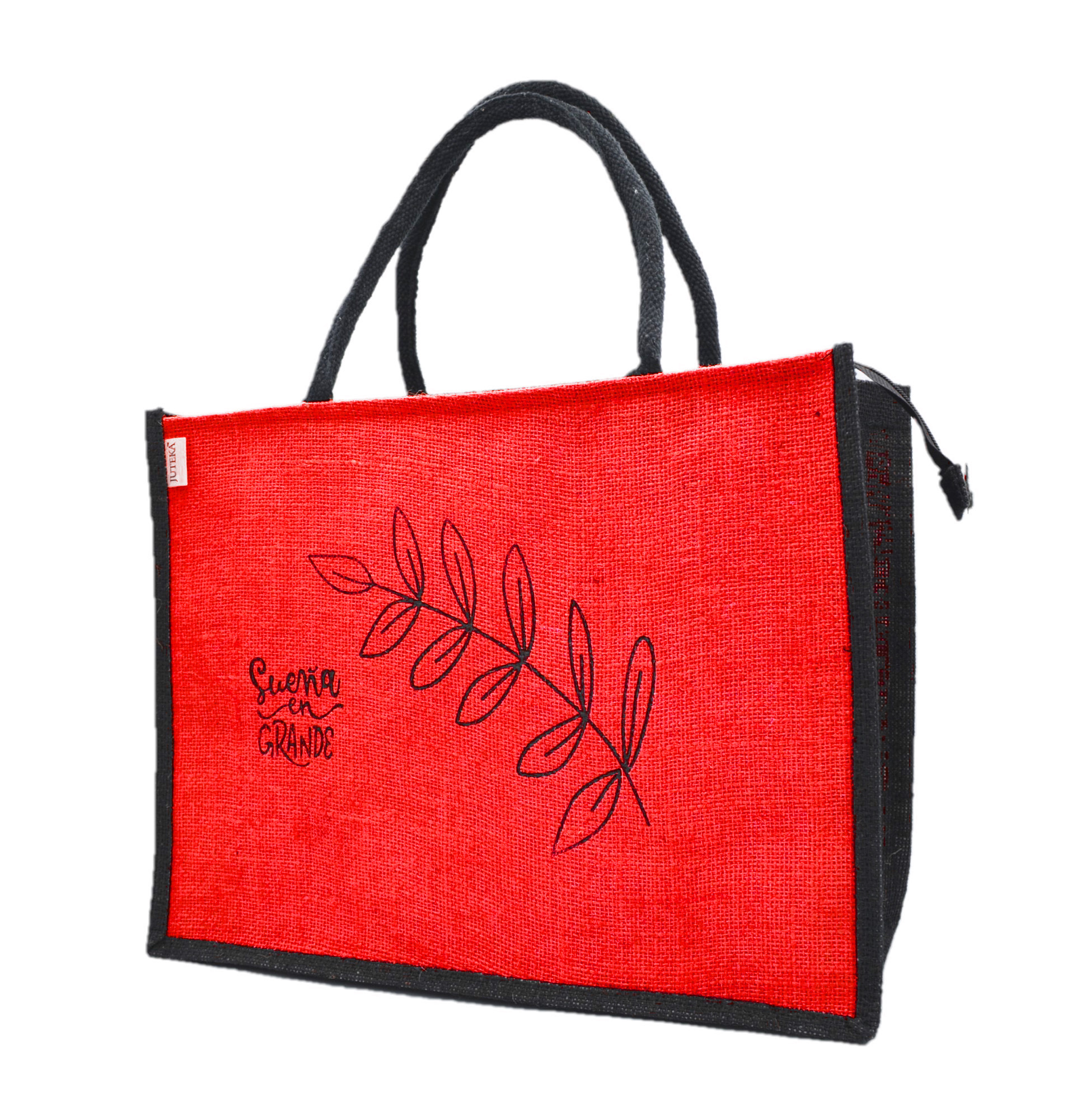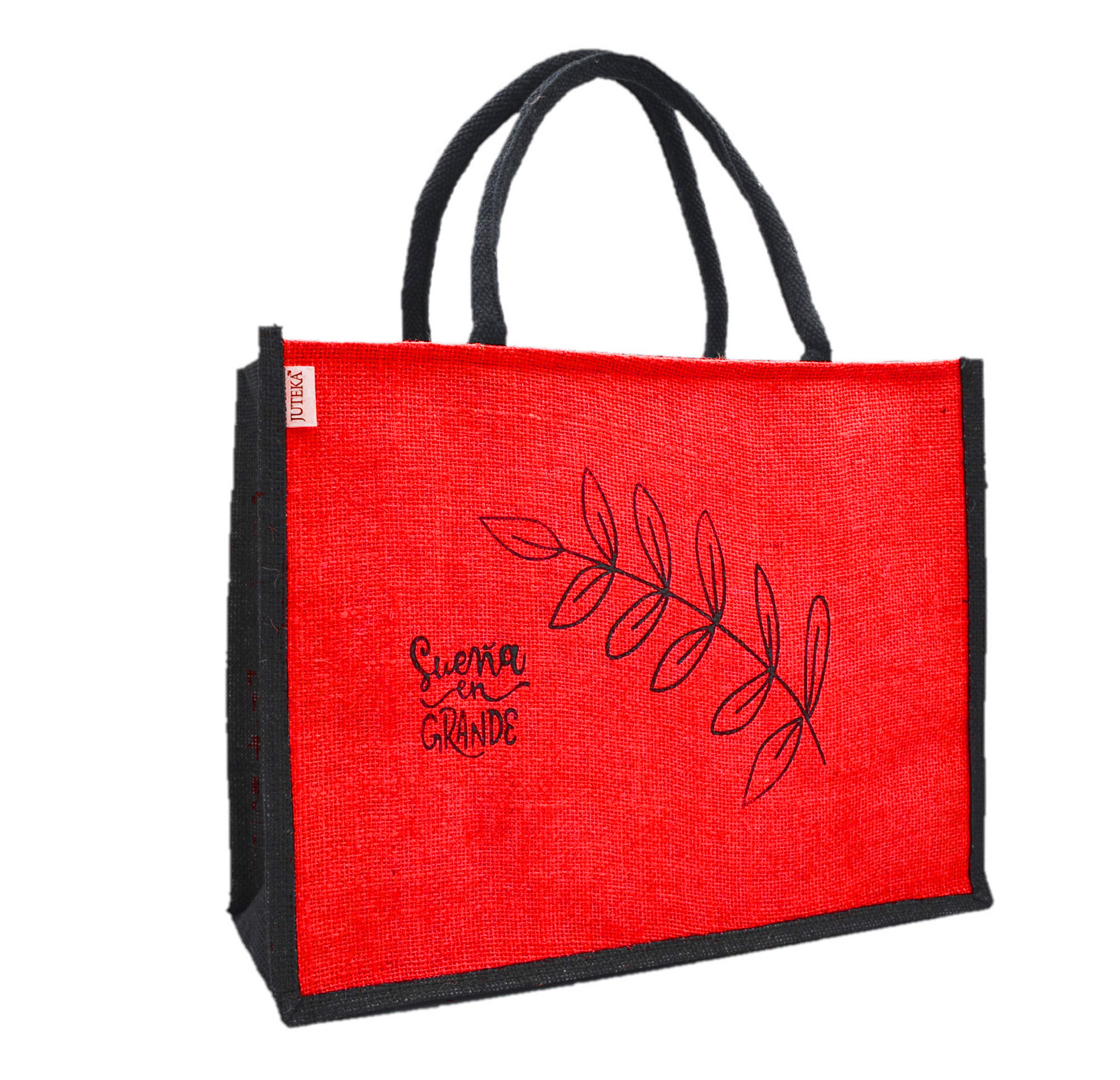 Add a pop of color to your daily routine with this bold and sustainable red jute bag. Designed with a sleek black leaf pattern and the motivational phrase "Sueña en Grande" (Dream Big), this bag is perfect for shopping, casual outings, or work essentials. Crafted from durable jute with sturdy black handles, it’s an eco-friendly and stylish choice for conscious shoppers.
