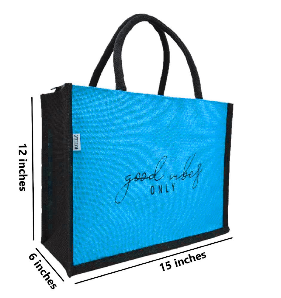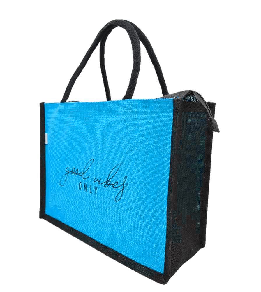 A bold and eco-friendly blue jute tote bag featuring black handles, a strong black border, and a convenient side zipper closure. The front showcases the uplifting phrase "Good Vibes Only" in stylish script, making it a fashionable yet functional choice for shopping, work, or everyday use. Sturdy, reusable, and trendy, this bag is perfect for those who love a pop of colour with a positive message.