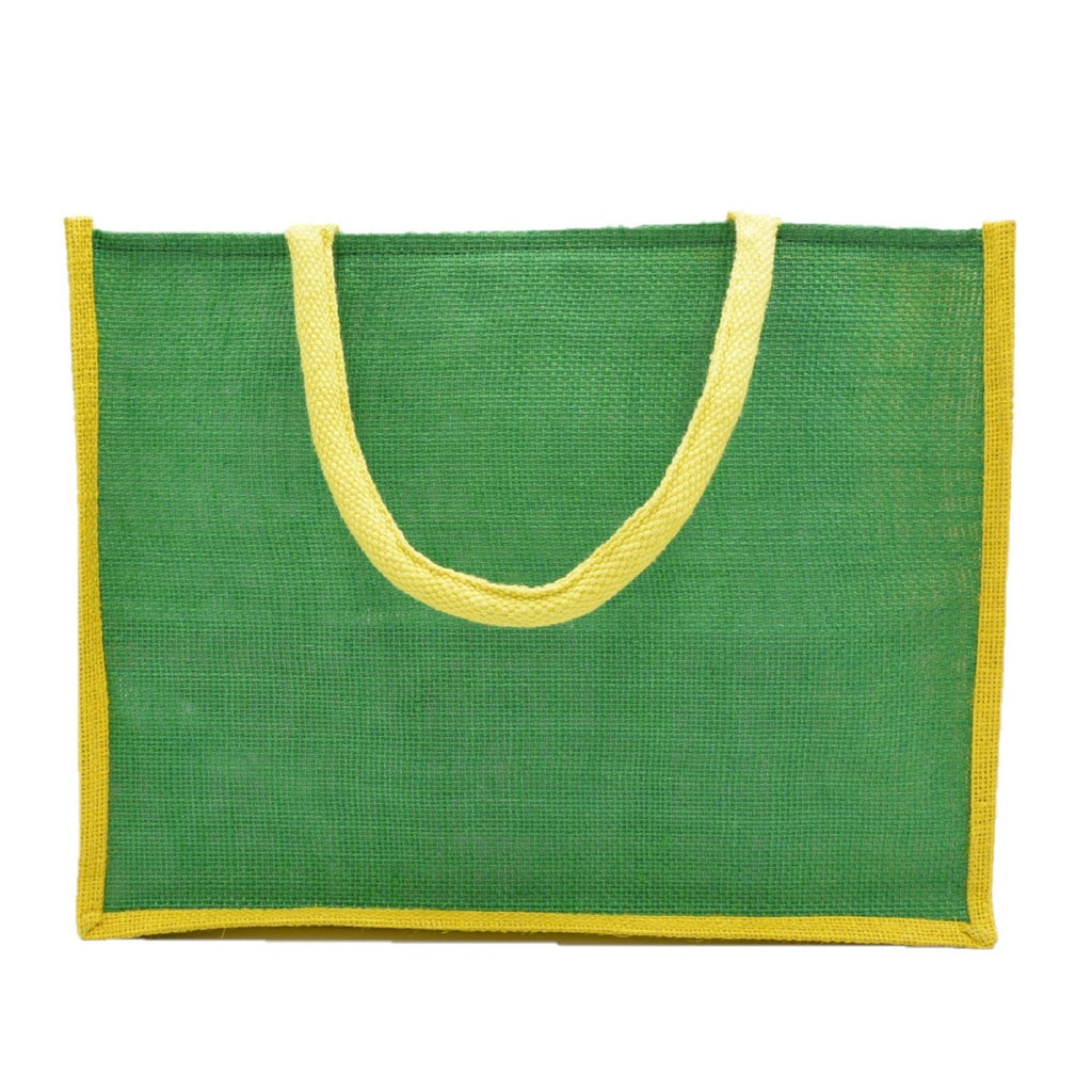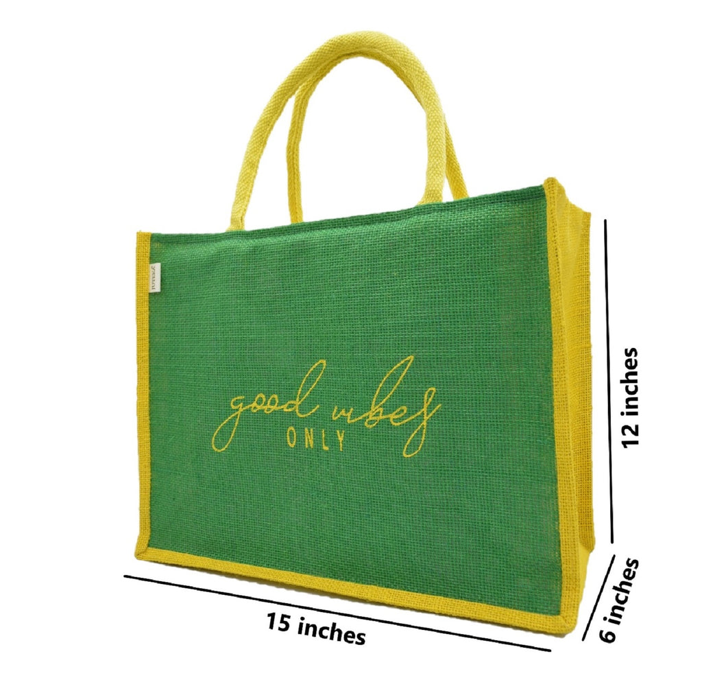 Spread positivity while staying eco-friendly with this stylish green jute tote bag, featuring a vibrant yellow trim and handles. The "Good Vibes Only" embroidery adds a cheerful touch, making it perfect for daily errands, shopping, or casual outings. Measuring 15 inches (W) x 12 inches (H) x 6 inches (D), this spacious and durable bag is both practical and fashionable. Ideal for those who love sustainable fashion with a pop of color!