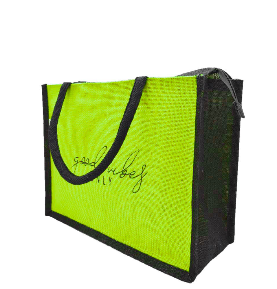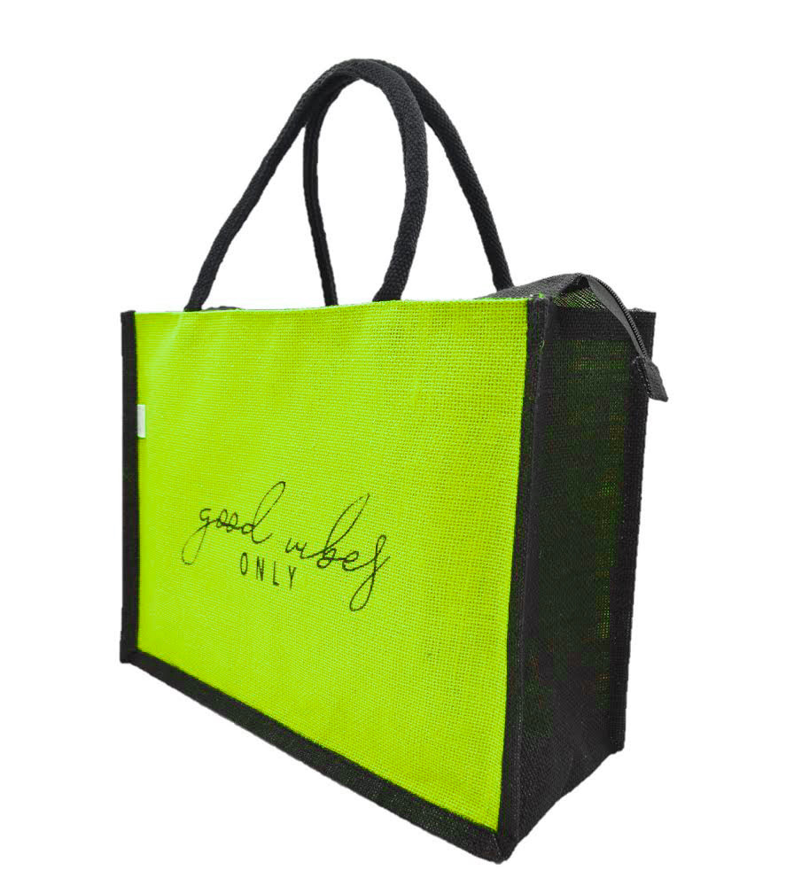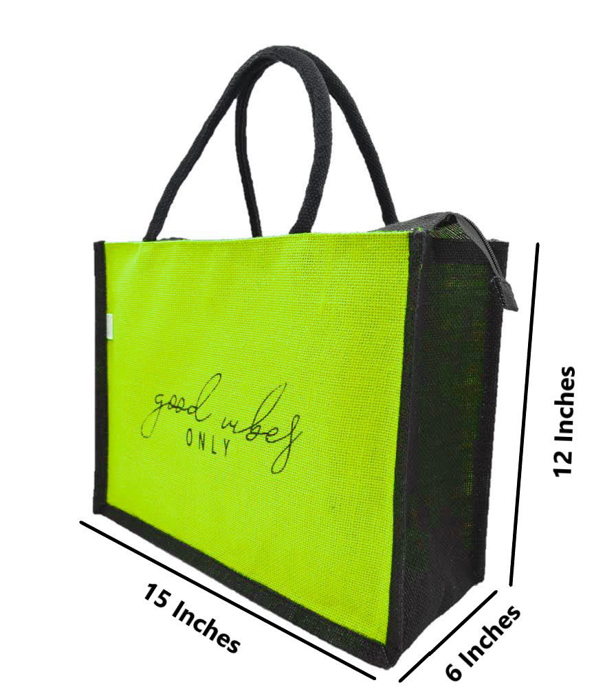 A stylish and eco-friendly lime green jute tote bag with black handles and border detailing. The front features the phrase "Good Vibes Only" in elegant black script, making it a perfect accessory for shopping, work, or casual outings. Durable, reusable, and fashionable, this bag adds a touch of positivity to your daily routine.