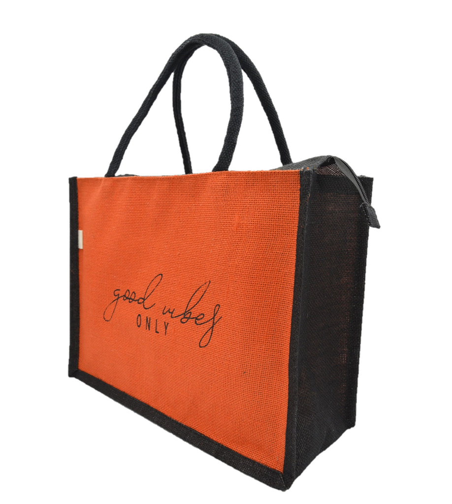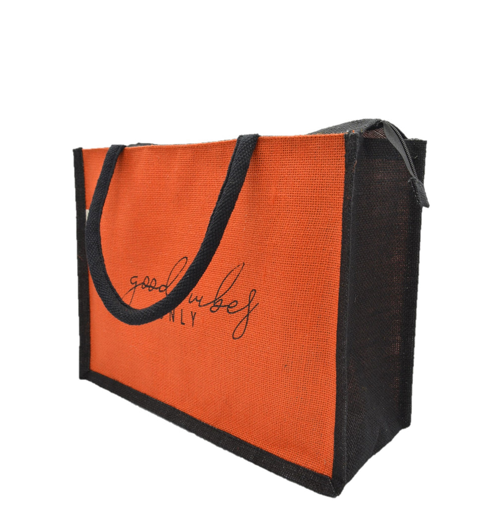 Carry positivity wherever you go with this eco-friendly blue jute tote bag, elegantly finished with black trim and handles. The "Good Vibes Only" embroidery in stylish cursive adds a charming touch, making it perfect for shopping, daily errands, or casual outings. Durable, spacious, and sustainable, this bag is designed for those who love practicality with a fashionable edge. Ideal for work, travel, or gifting!