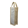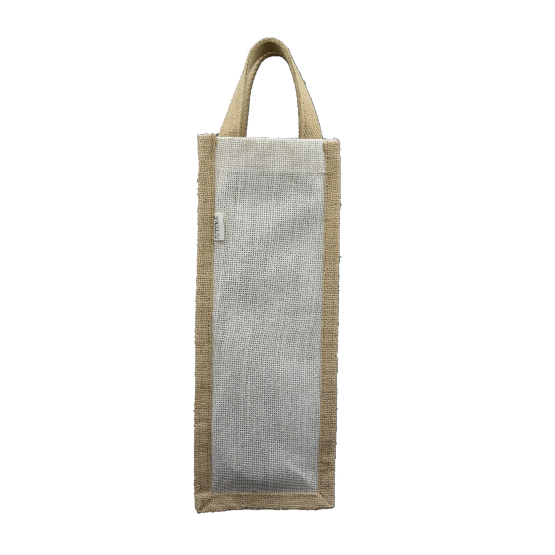 This sophisticated jute bottle bag features a neutral white front panel with natural beige side panels and handles, giving it a minimalist yet elegant look. Made from eco-friendly, biodegradable jute, this reusable bag is perfect for carrying and gifting wine, spirits, or other bottled beverages. Its sturdy design ensures durability, making it an excellent choice for sustainable and stylish packaging.