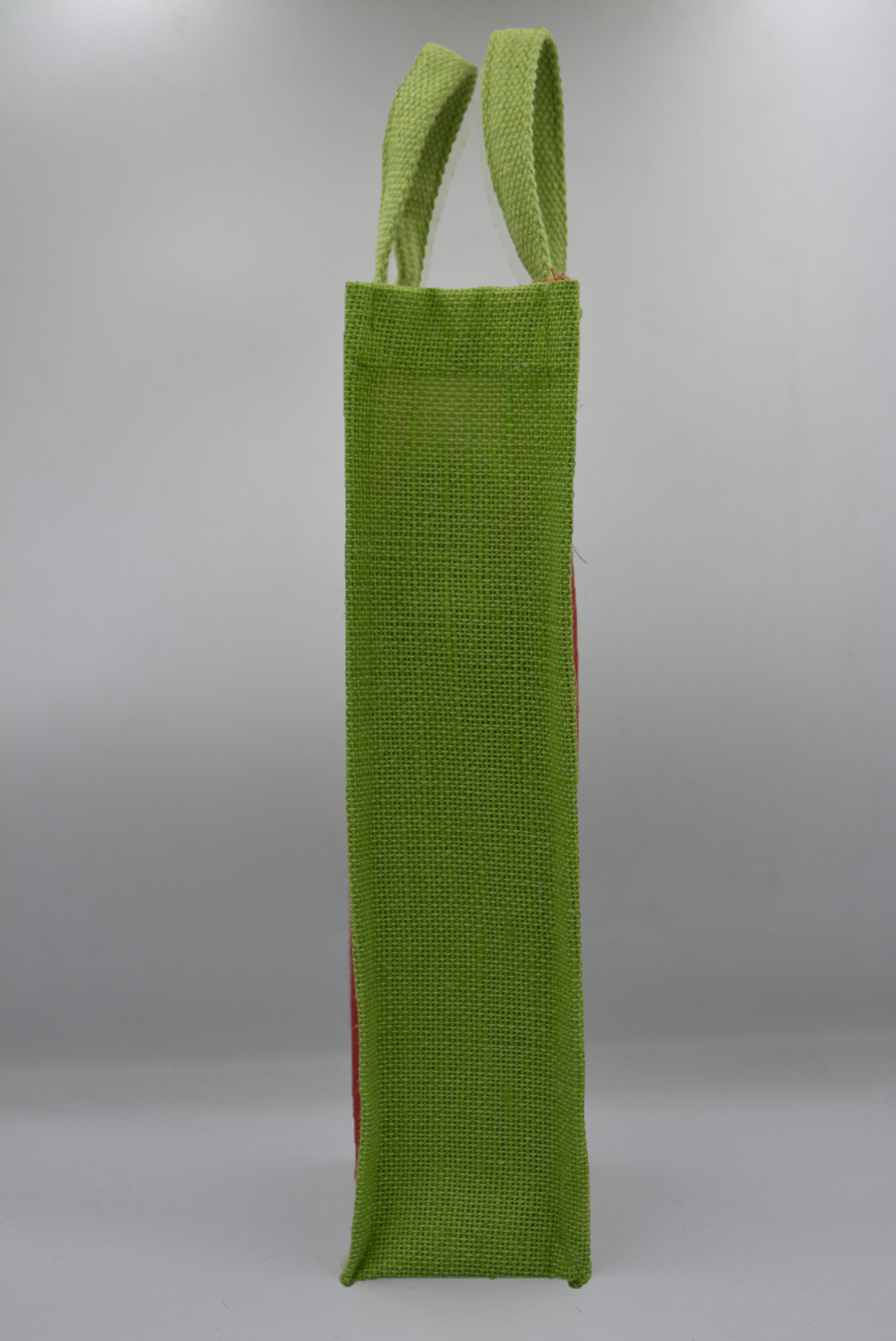 This stylish jute bottle bag features a bold red front panel contrasted with green side panels and sturdy handles. Designed for carrying wine, champagne, or other bottled gifts, this eco-friendly and reusable bag is made from durable, biodegradable jute material. Perfect for gifting or personal use, it adds a touch of sustainability to any occasion.