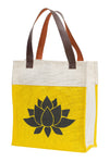 Add a pop of colour to your daily routine with this eco-friendly yellow jute tote bag, featuring a bold black lotus print. Designed for sustainability and durability, this stylish bag is crafted from natural jute fabric with a sturdy construction. The comfortable leather-like handles provide an elegant touch, making it perfect for shopping, work, or casual outings. Reduce your plastic use and make a statement with this chic and eco-conscious tote.