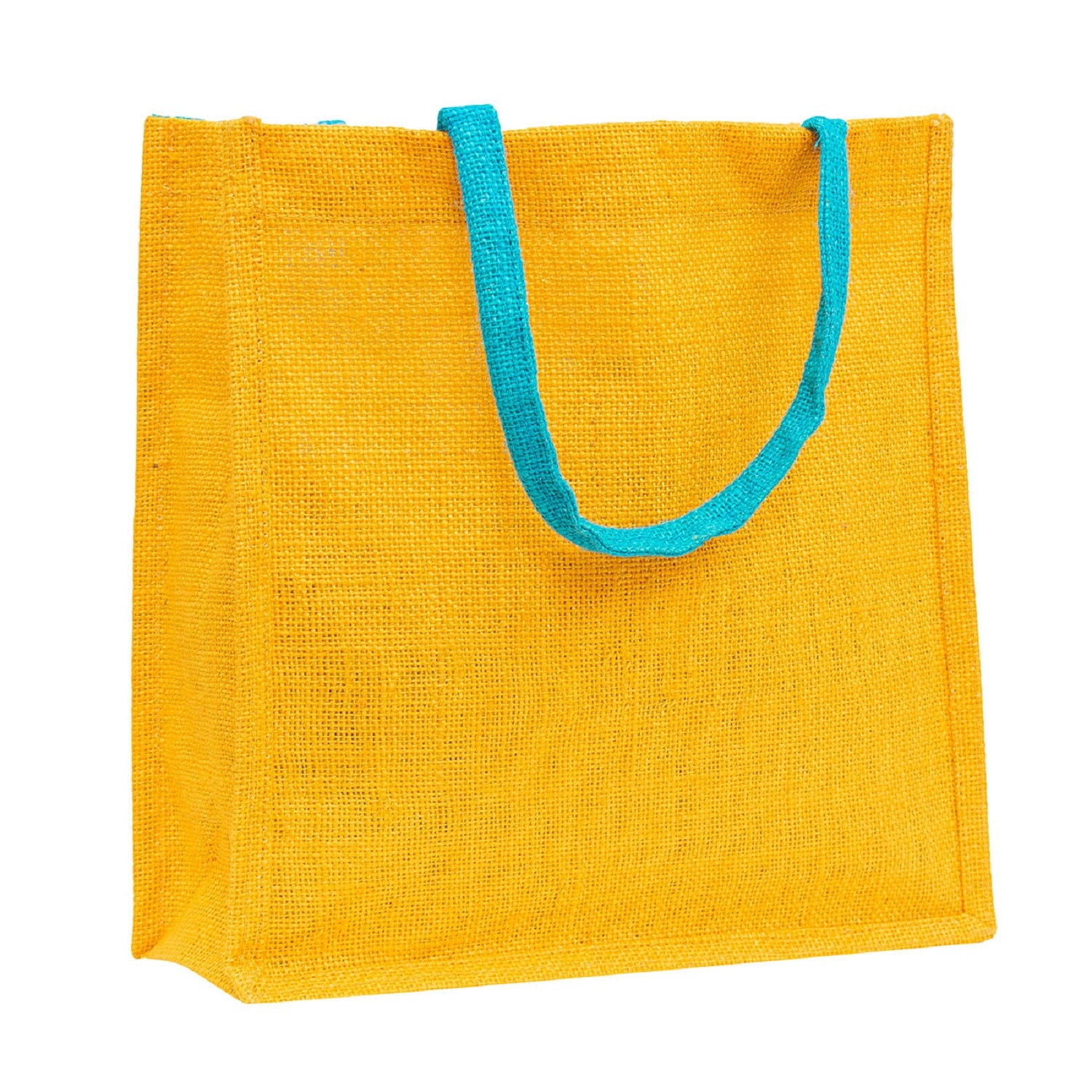 Add a pop of colour to your daily routine with this eye-catching yellow and teal jute tote bag. Featuring a bold geometric design, this eco-friendly bag is both stylish and practical. The durable jute material ensures longevity, while the sturdy teal handles provide a comfortable grip. Perfect for shopping, beach outings, or everyday errands, this tote is a vibrant and sustainable choice for those who love fashion with a purpose.